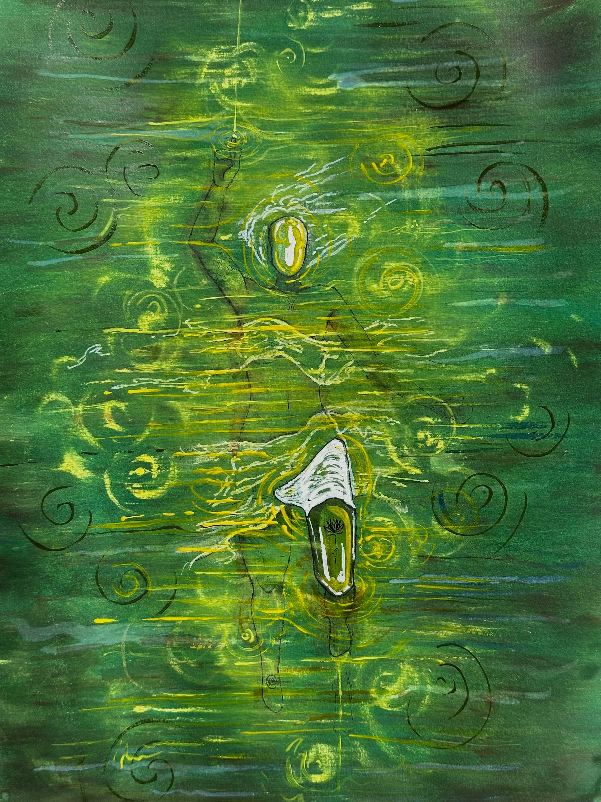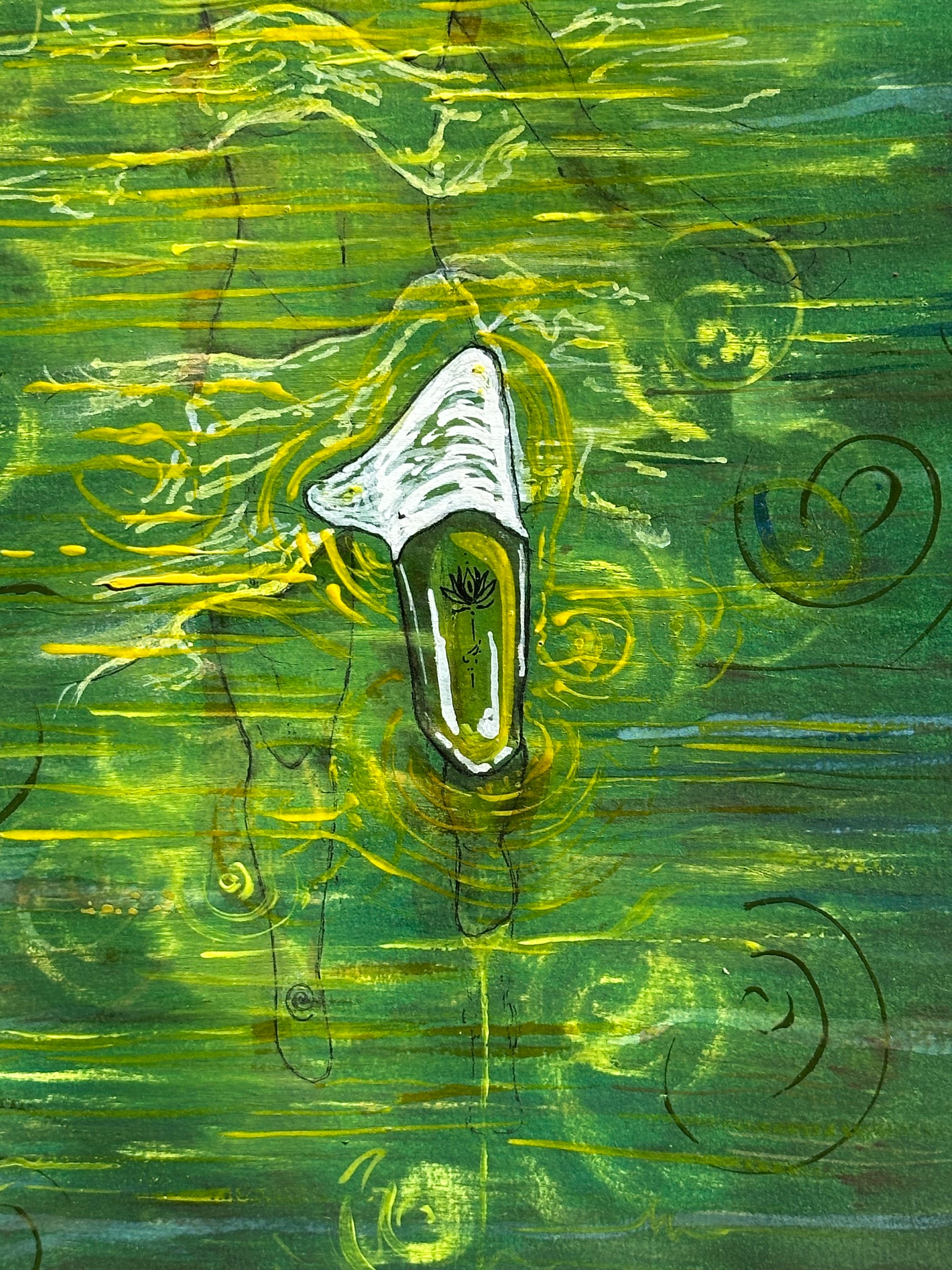 Tathātā: Floating in Suchness is a meditative exploration of presence and surrender, inspired by Buddhist teachings of non-attachment and the true nature of reality. Created with fluid watercolour and quiet ink contrasts, this piece invites viewers to dissolve ego and embrace stillness as transformation. It reflects the journey of letting go, accepting all parts of oneself without judgment, and finding peace in simply being. Like floating in water, surrender becomes not loss, but presence itself. Echoing the saying “She Who Holds Without Grasping listens to the weight of your body without hearing your name.”